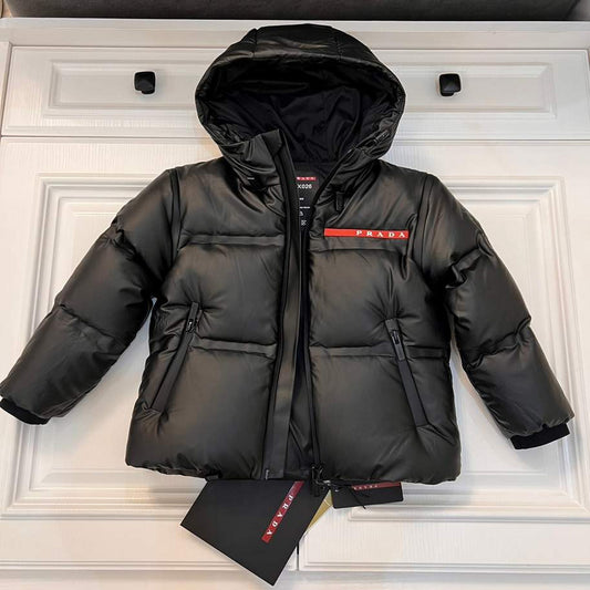 Prada Kids Black Puffer Jacket with Red Logo Strip