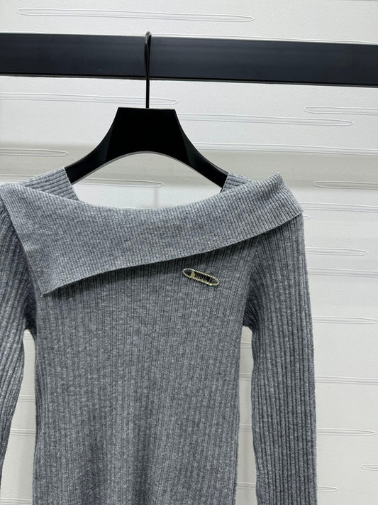 Versace Grey Ribbed Off-Shoulder Sweater with Safety Pin Detail