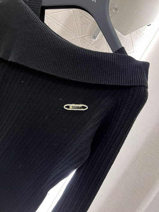 Dior Ribbed Knit Off-Shoulder Sweater – Black